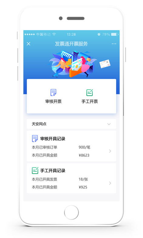 用户打开手机微信搜索“发票通企业版”订阅号,扫码开票,点击“开票服务”选择“开票网点”,确认点击审核开票,开具成功后将电子发票推送给消费者